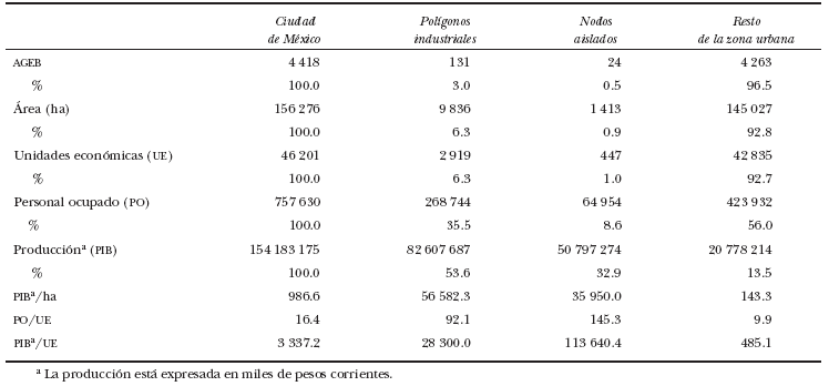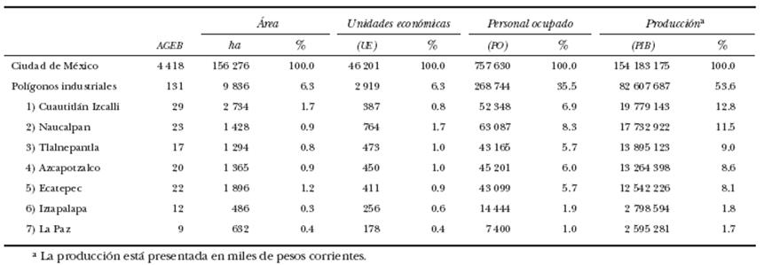 Los siete polígonos industriales concentran 53.6% del pib manufacturero de la urbe, lo cual implica una magnitud de producción 57 veces mayor que la media metropolitana. Estas zonas agruparon 31 AGEB con muy alta actividad, que en su mayoría formaron los núcleos industriales, más otras 100 que tenían una producción superior a la media metropolitana, con lo cual totalizaron 131 (Cuadro 1). En cuanto a la centralización general de la producción, en estas zonas se encuentra solamente 6.3% de los establecimientos manufactureros, los cuales se caracterizan por ser de gran tamaño según el personal ocupado, con92.1 trabajadores por unidad económica, es decir, 5.6 veces más que el promedio de la ciudad de 16.4 (Cuadro 1). Adicionalmente, estas empresas también centralizan la producción pues su PIB/UE es de 28.3 millones de pesos, lo que equivale a 8.5 veces más que la media metropolitana.