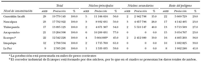 De los cuatro polígonos con núcleos secundarios, solamente en Cuautitlán Izcalli y Naucalpan se observó una elevada concentración del PIB industrial en los núcleos principales, al contener 56 y 50%, respectivamente (Cuadro 3). En los dos restantes corredores de Tlalnepantla y Ecatepec, la estructura polinuclear es más notable dado que los núcleos no alcanzan a concentrar la mayoría de la actividad manufacturera. En el corredor de Ecatepec, específicamente, sus dos núcleos principales sólo aglomeran 45% de la producción del polígono. En ambos corredores, la mayoría de la actividad se encuentra distribuida en todos los núcleos, tanto principales como secundarios. Este fenómeno es interesante, pues es posible detectar el policentrismo tanto a escala metropolitana, a partir de la formación de nodos y corredores industriales, como en el interior de algunas de dichas concentraciones (Cuadro 3).