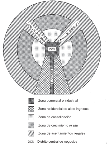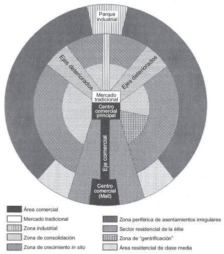 Con el fin de plasmar esta realidad, se han formulado modelos que reconocen la existencia de formaciones extendidas debido a la influencia determinante de las vías de comunicación. Hoyt (1940) ya había definido la importancia de la infraestructura vial para la conformación de la estructura urbana, en especial para la localización de las fábricas. Diversas concentraciones de la actividad se logran a partir de la existencia de vías con origen en el centro de la ciudad; como resultado, dichos sectores se iniciaban en la frontera del distrito central de negocios para extenderse hacia la periferia urbana. Es interesante el postulado de Hoyt, pues de manera incipiente hace referencia al factor temporal para definir la estructura espacial de la ciudad. La evidencia empírica del amcm muestra que el punto de partida de estos corredores no es el distrito central de negocios tradicional, sino los nodos de Azcapotzalco y Naucalpan, que constituyen los polígonos industriales más antiguos de la urbe.