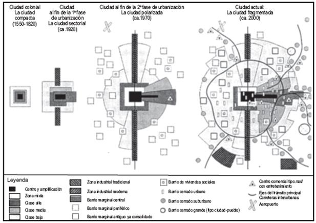 Según los anteriores esquemas, parecería que a mediados del siglo XX todavía persistía una estructura urbana monocéntrica en las ciudades latinoamericanas y que el policentrismo habría aparecido posteriormente. Sin embargo, conforme al modelo de Borsdorf (2003) que incorpora la evolución secular de las ciudades, es posible constatar que este proceso de descentralización parece haberse iniciado mucho antes. El autor define cuatro etapas del desarrollo de los asentamientos urbanos latinoamericanos: la época colonial o compacta (de 1550 hasta 1820); la ciudad sectorial (1820 a 1920); la ciudad polarizada (1920 a 1970); y la ciudad fragmentada (1970 a 2000). A partir de la segunda fase, el autor reconoce la formación de corredores industriales que parten de la zona central, en forma similar a la propuesta de Hoyt para las ciudades americanas. Durante la tercera fase identifica la formación de zonas industriales en la periferia urbana, sugiriendo el policentrismo a partir de núcleos y corredores (Gráfica 3).