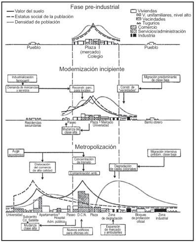 Borsdorf (2003) elaboró un modelo donde incorporó el desarrollo histórico para comprender la estructura de las actividades urbanas. En su propuesta identifica la creación de corredores industriales y clasifica a las plantas localizadas en su interior como tradicionales. Adicionalmente incorpora concentraciones periurbanas y suburbanas como nodos, donde se establece la industria moderna. En la Ciudad de México se observa una distribución completamente opuesta, pues los nodos industriales están más bien ubicados en la zona central y, debido al momento histórico de su creación hacia mediados del siglo pasado, alojan unidades económicas que producen mercancías tradicionales, principalmente en el ramo de fabricación de prendas de vestir, en contraste con las fábricas de más reciente creación en las periferias de los corredores.