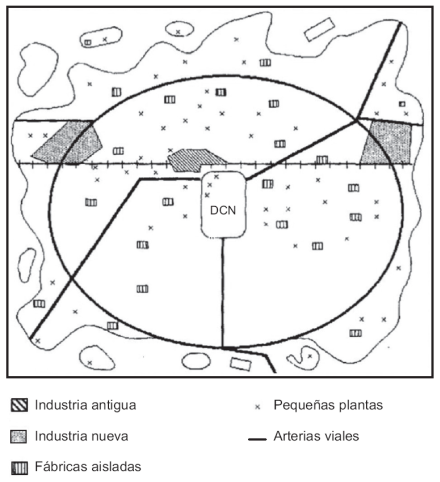 Hoyt (1940), en su esquema de sectores plantea que la industria, como las otras actividades, se concentra de forma radial partiendo del centro urbano. Harris y Ullman (1945) afirman que las actividades se agrupan por núcleos; con su propuesta son los primeros en diferenciar entre la industria ligera y la pesada.6 Garreau (1991) también encontró una tendencia hacia la creación de subcentros urbanos, donde la actividad económica tendía a localizarse en dichas áreas, llegando a superar en importancia a la zona central.