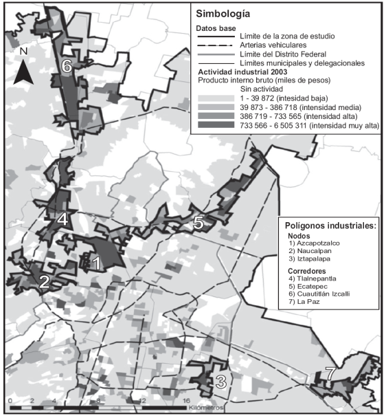 Estas siete agrupaciones de AGEB con producción muy alta se encuentran rodeadas por actividad industrial de menor intensidad, pero mayor a la media metropolitana. La conjunción de los siete núcleos más las AGEB espacialmente contiguas y con producción superior al promedio constituyen siete grandes polígonos industriales localizados en las circunscripciones de: Azcapotzalco, Naucalpan, Tlalnepantla, Ecatepec, Cuautitlán Izcalli, Iztapalapa y La Paz.9 En Ecatepec coexisten dos núcleos cercanos en una sola área de influencia, por lo que se les identificó únicamente como un solo polígono de muy alta actividad (Mapa 2).