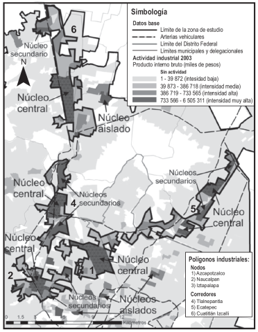 Por otro lado, el nodo de Naucalpan y los corredores de Cuautitlán Izcalli, Tlalnepantla y Ecatepec, además de los núcleos principales formados por más de una AGEB con alta actividad industrial, contenían algunas áreas aisladas de este tipo, pero inmersas en los nodos y corredores (Mapa 3). A estas áreas de alta producción, pero sin contigüidad con otra AGEB de alta intensidad, se les denomina núcleos secundarios; por lo que la estructura interna de estos polígonos industriales se podría caracterizar como multinuclear, estando éstos inmersos a su vez en una organización industrial metropolitana de corte policéntrico.