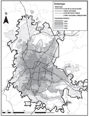 En 1980 hubo un claro freno en el crecimiento del AMCM. Así, mientras de 1960 a 1970 registró un incremento de 340 km2 en su tejido construido, durante la década siguiente se había extendido apenas 198 km2, totalizando 834 km2 a finales de la década de los setenta. En este periodo, sin embargo, la expansión del área urbana fue más homogénea desde el punto de vista geográfico, es decir, ya no se presentó el fuerte impulso hacia el norte y el oriente que se experimentó en la década anterior. Se observa un proceso de despliegue siguiendo el contorno urbano prevaleciente, pero ligeramente acentuado en el norte y el poniente (Mapa 4).
