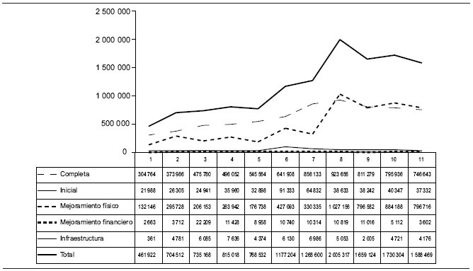 La dinámica de la oferta de viviendas / financiamiento entre 2001 y 2011, que viene creciendo, muestra un punto de inflexión en 200821 que da inicio a una declinación que se mantiene hasta el fin del periodo. La cantidad anual total cae aproximadamente el 20%, al pasar de 2 millones a 1.6 millones. Esa disminución corresponde tanto a las viviendas terminadas como a los mejoramientos físicos. El resto de los programas, con una participación casi irrelevante, se mantiene sin grandes modificaciones, aunque se da un crecimiento importante en los programas de infraestructura, pero en una cantidad realmente muy limitada (Gráfica 1).