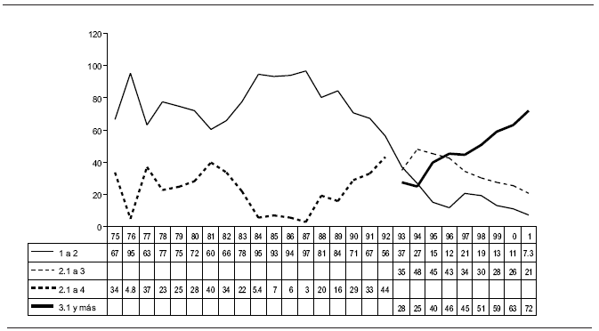 Conviene analizar de manera uniforme la distribución de los créditos en el periodo total, para lo cual es conveniente redefinir la distribución por salarios mínimos en lo que llamamos "tramos" socioeconómicos que permitan observar su continuidad. Con base en la definición de los cajones en los dos periodos proponemos cuatro tramos: 1) de 1 a 2 salarios mínimos, 2) de 2.1 a 3, 3) de 2.1 a 4 y 4) de 3.1 en adelante. Esos tramos, tal como están construidos, no son continuos, sino que se traslapan. Con esa base es posible llenar todo el periodo: solamente el tramo 1 cubre la totalidad de esos años; los tramos 2 y 4 lo hacen desde 1993, y el tramo 3 de 1975 a 1992 (Gráfica 2).