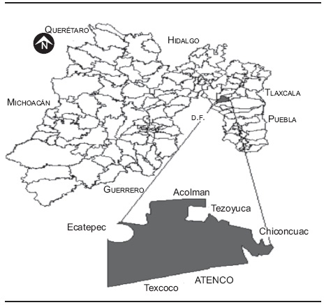El municipio de Atenco3 se localiza en la parte central del Valle de México y en el oriente del Estado de México; se encuentra separado del Distrito Federal por los municipios de Nezahualcóyotl y Ecatepec. Se ubica a 22 kilómetros de la Ciudad de México y pertenece a la región de Texcoco. Limita al norte con los municipios de Acolman y Tezoyuca, al sur con el municipio de Texcoco, al este con Chiautla, Tezoyuca y Chiconcuac, y al oeste con el municipio de Ecatepec (Mapa 1).