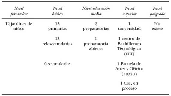 Al iniciarse el conflicto social (2001) no había en el municipio centros importantes de educación, como en Texcoco, pero en el año 2011 ya funcionaba la Universidad Mexiquense del Bicentenario,4 a la que se le conoce como la "Unidad Académica Universitaria Atenco", que se ubica en la comunidad Santa Isabel Ixtapan, y que imparte dos licenciaturas: Ingeniería Industrial e Ingeniería en Tecnologías de la Información y Comunicaciones. Para 2010 el territorio contaba con 51 escuelas de diferentes niveles; en el Cuadro 1 se presentan sus características.5