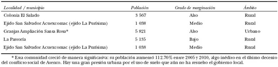 Sin embargo hay un crecimiento en otras partes del territorio del municipio de Atenco, y ejemplo de ello son las localidades de la colonia El Salado, Granjas Ampliación de Santa Rosa, la cual ha presentado un aumento poblacional de importancia en el último decenio; La Pastoría duplicó su población sólo en el lustro 2005 a 2010 de 2 240 a 5 135 habitantes.6 Atenco creció hacia sus comunidades y no en su cabecera municipal. El Cuadro 2 muestra la población que creció de manera importante en algunas comunidades de la localidad; también presenta el grado de marginación y el ámbito de su actividad según el INEGI en el año 2010.