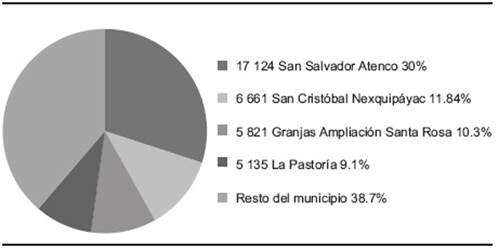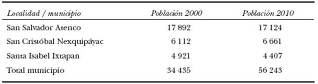 San Cristóbal Nexquipáyac es la segunda comunidad más grande del municipio; pasó de una participación poblacional con respecto a la totalidad del municipio de 18.75% en 1970 (1 990 habitantes) a 17.75% en el año 2000 (6 112 habitantes), y en el año 2010 reportó un total de 6 661 habitantes, con un leve aumento de 545 personas. En Santa Isabel Ixtapan había 2 385 habitantes en 1990, y para el año 2000 eran 4 921 -14.29%-; en 2010 se registraron 4 407 pobladores, con una disminución de 514 personas entre 2000 y 2010 (INEGI, 1990, 2000 y 2010).Véase el Cuadro 3.