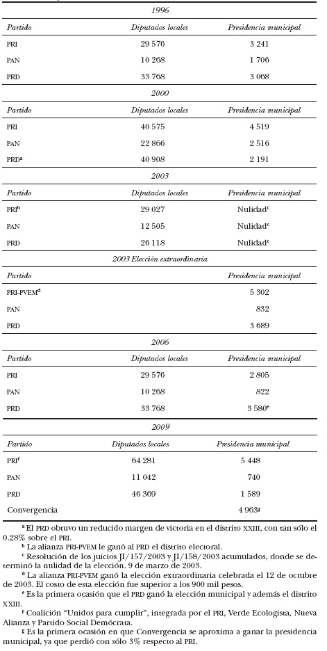 Instituto Electoral del Estado de México (2011), "Resultados de las elecciones de los años 1996, 2000, 2003, 2006 y 2009", Numeraria Edomex. Disponible en: <Disponible en: http://www.ieem.org.mx/procesoselectorales/ayuntamientos > (22 de enero de 2012).