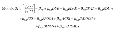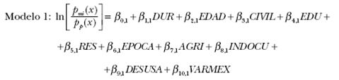 En este modelo se prueban los efectos de ser o no indocumentado (INDOCU) y de la ocupación o no en la agricultura (AGRI), así como de dos variables macroeconómicas: el desempleo en Estados Unidos (DESUSA) y la tasa de variación anual en el producto interior bruto per cápita en México en dólares de 1980 (VARMEX). Las cuatro variables son rezagadas un año con el fin de minimizar posibles problemas de endogeneidad.