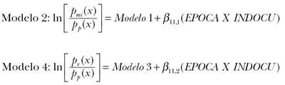 Se quiere analizar si el efecto del estatus de documentación está mediado de alguna manera por las épocas de la migración, por lo que se establece una interacción entre ambas. De esta interacción resultan los siguientes dos modelos logísticos a estimar simultáneamente:
