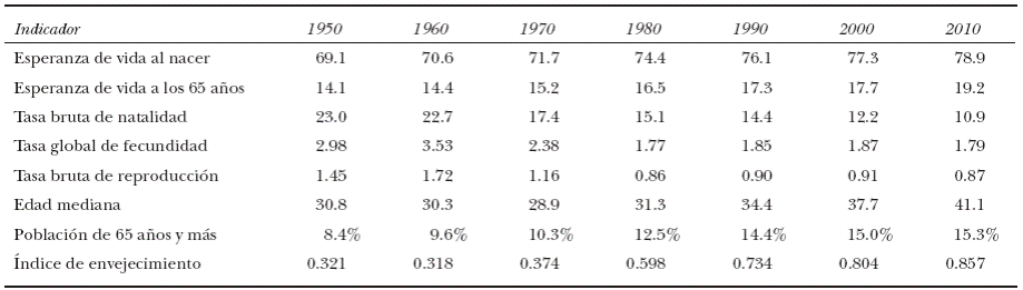 Por un lado, el cambio y la modernización social han conllevado un evidente mejoramiento en las condiciones de vida de la población, mismo que se evidencia en el continuo incremento de su esperanza de vida, la que pasa de 69 años en 1950 a 79 en 2010. Mención especial cabe hacer respecto a la esperanza de vida a los 65 años, esto es, el número de años que espera vivir en promedio una persona que haya cumplido dicha edad. Al respecto, los datos indican que este promedio pasa de 14 años en 1950 a 19.2 en 2010. En otras palabras, junto con el incremento de la proporción de personas que sobreviven a los 65 años, también se incrementa su esperanza de vida a partir de esa edad.