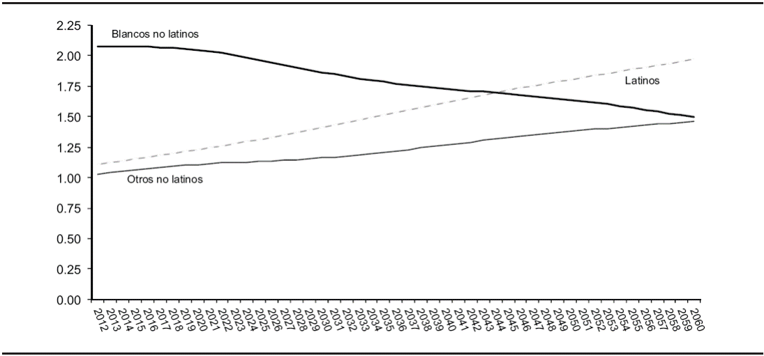 Este bajo aporte al crecimiento demográfico total se explica por el incremento del de otros grupos étnicos, pero sobre todo por el freno de su crecimiento demográfico. Por lo pronto, ya entre 2000 y 2010 la población blanca no latina se incrementó en menos de 3 millones de personas, lo que representa una tasa de crecimiento de sólo 0.14% anual en promedio para ese periodo. De esta forma, la particular dinámica de los componentes demográficos (baja fecundidad, envejecimiento de la población, retraso en los nacimientos, entre otros) plantea ya una situación cercana a una población sin crecimiento, dinámica que de mantenerse en las próximas décadas implicaría el inicio del descenso demográfico de este grupo étnico, tal como lo advierten las más recientes proyecciones de población elaboradas por la Oficina del Censo de Estados Unidos.2