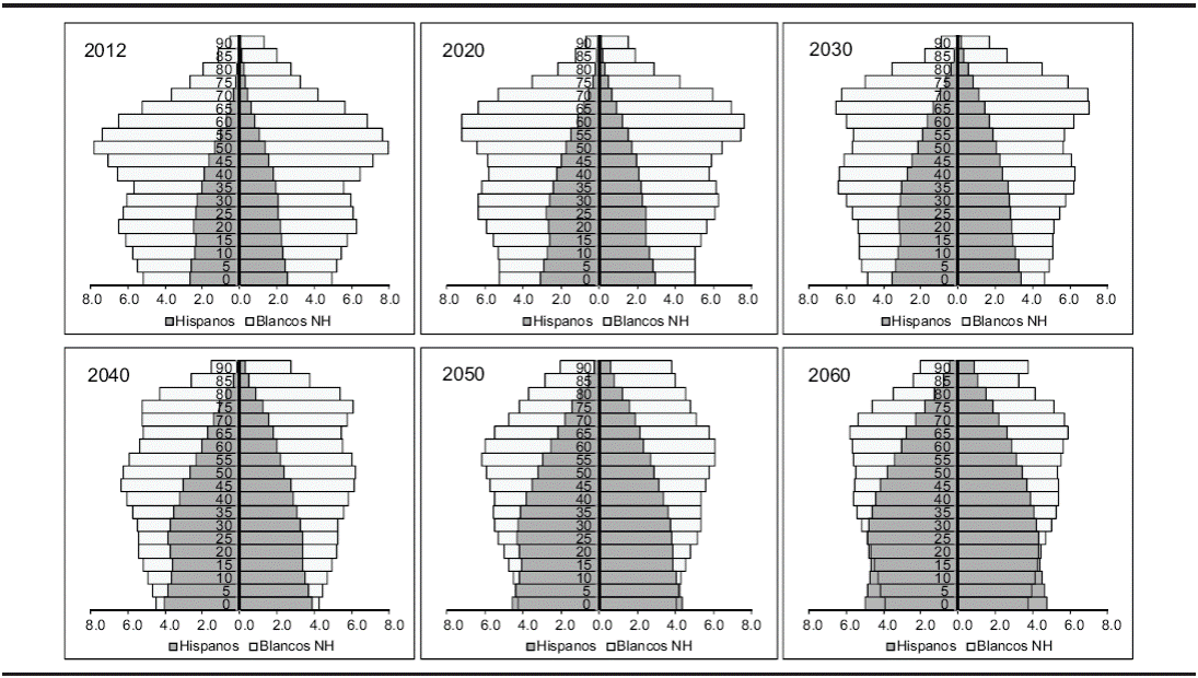 La base de esta peculiar composición étnica de la pirámide de edades es la combinación de las dos tendencias que hemos señalado. Por un lado, el envejecimiento de la población blanca no latina, que implicaría un cambio sustancial en su estructura etaria, y en donde la población adulta y adulta mayor predominaría por sobre su población joven e infantil; y por otro lado, el hecho de que en los nacimientos los latinos tenderán a ser el principal grupo étnico. De hecho, la estructura etaria de la población latina, incluso hacia 2060, mantendría la clásica forma piramidal de una población en crecimiento, lo que indica una población aún joven y con gran dinamismo demográfico.