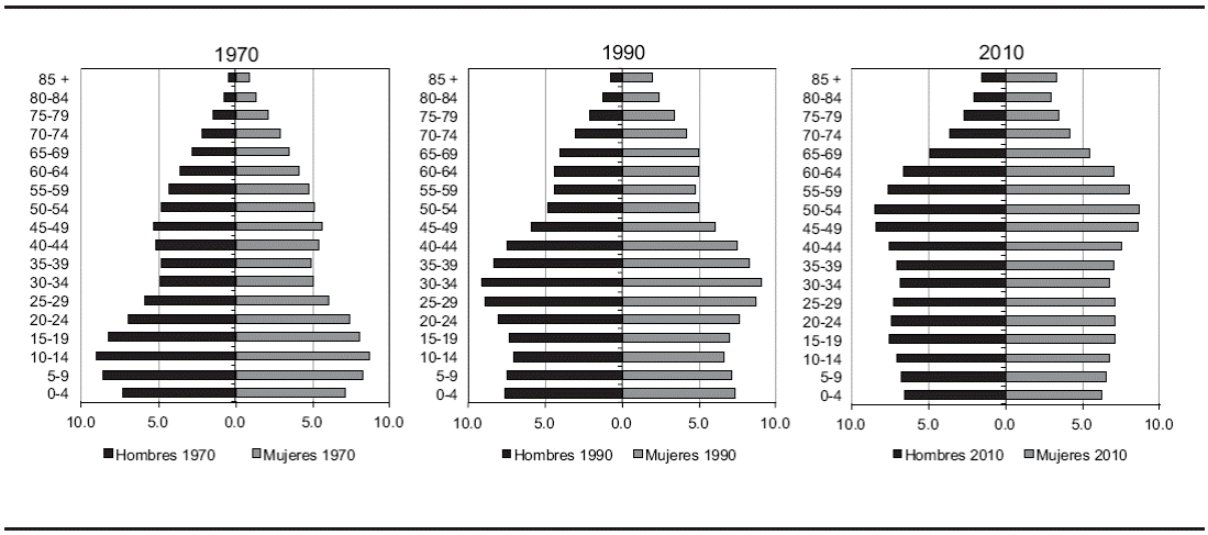 Esta dinámica de las variables demográficas básicas es la base del envejecimiento de la población blanca no latina, mismo que se manifiesta en el cambio de su estructura etaria. Como se observa en las pirámides de edades, se ha pasado de una estructura etaria de tipo piramidal en 1970, a una que asemeja más una forma ojival en la actualidad. En el primer caso, no hay duda de que esa forma se deriva del efecto que tuvo el baby boom de la posguerra, que implicó un incremento de la natalidad y que se refleja en el alto volumen de población menor de 20 años hacia 1970. Sin embargo, en la medida en que se profundizó el descenso de la fecundidad, la población infantil se fue reduciendo cada vez más, lo que se refleja en el angostamiento de la base de la pirámide de edades. Asimismo, en la medida en que se incrementa la esperanza de vida y la longevidad de la población general, junto con el gran volumen de población que generó el mismo baby boom , se produce un incremento significativo de la población adulta y adulta mayor, alterando de ese modo los tradicionales equilibrios demográficos, al pasarse de una población joven a una en proceso de envejecimiento.