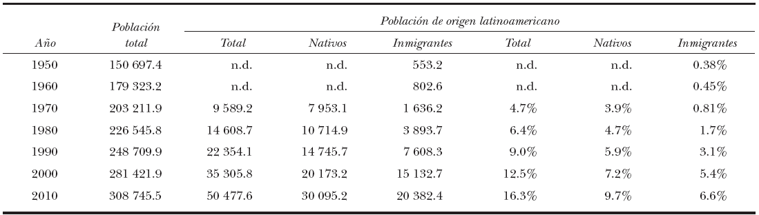 A este crecimiento de la inmigración latinoamericana hay que agregar la dinámica de la población nativa de origen latino, esto es, los descendientes de los inmigrantes, también llamados inmigrantes de segunda y tercera generaciones. Al respecto, los datos indican que esta población pasó de menos de 8 millones en 1970 a 30 millones en 2010.