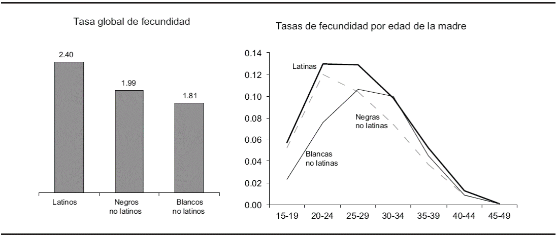 Asimismo, y a diferencia de las mujeres afroamericanas, las latinas muestran además una cúspide dilatada, esto es, que en todo el tramo de edad de los 20 a los 29 años se mantiene una elevada tasa de fecundidad, muy por encima de la de los demás grupos étnicos. Se trata en definitiva de una fecundidad temprana y elevada, lo que indica tanto un mayor nivel de fecundidad como también un mayor ritmo en el reemplazo demográfico.