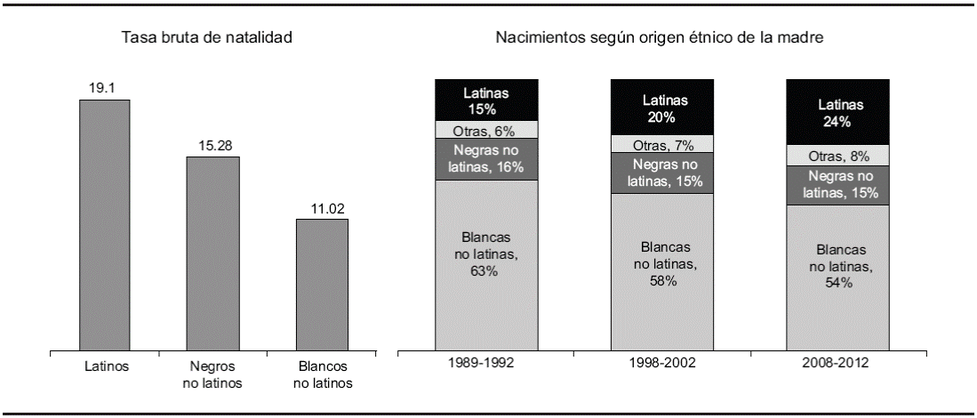 En el primer caso los datos indican que entre 2008 y 2012 la tasa bruta de natalidad de los latinos fue de 19.1 nacimientos por cada mil habitantes, cifra que es 25% superior a la que prevalece entre la población negra no latina, y casi 75% superior a la de la población blanca no latina. Esta mayor tasa de natalidad se manifiesta ya en un cambio en la composición de los nacimientos según origen étnico y migratorio de los niños y sus madres. Desde 1990 hasta la fecha, el volumen anual de nacimientos en Estados Unidos fluctúa alrededor de los 4 millones de niños y niñas. Sin embargo, su composición se ha ido modificando a lo largo de estos años, de tal modo que si a inicios de los noventa 63% de los nacimientos correspondían a madres de origen blanco no latino, hoy en día su aporte se ha reducido a 54% de los nacimientos. Por el contrario, la participación de las madres latinas ha pasado de 15% a inicios de los noventa, a 24% entre 2008 y 2012.