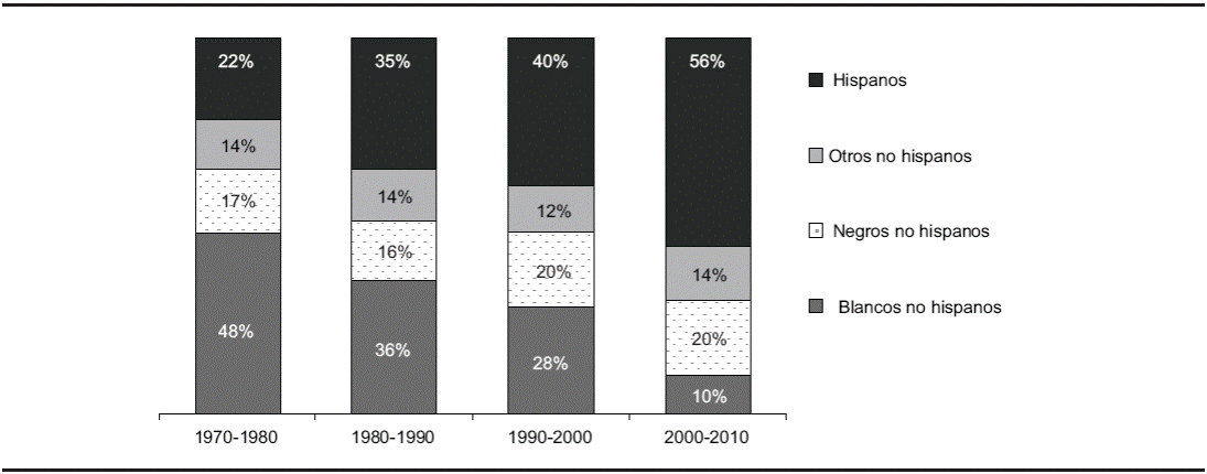 A partir de entonces inicia un proceso de cambio en cuanto al aporte de cada grupo étnico y migratorio al crecimiento demográfico. Al respecto, los datos más relevantes se refieren al continuo y persistente descenso de la aportación de la población blanca no latina, así como su contraparte, el continuo y persistente incremento de la contribución de la población de origen latino. En el primer caso, ya en los ochenta el aporte de los blancos no latinos se reduce a 36%, para continuar descendiendo en las siguientes décadas, hasta llegar a contribuir con tan sólo 10% del crecimiento demográfico entre 2000 y 2010. Es decir, a pesar de que representan más de 65% de la población, su contribución al crecimiento se reduce apenas a 1 de cada 10 nuevos residentes en ese país.