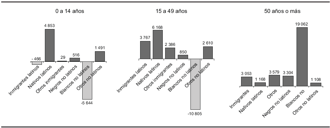En el caso de la población en edades reproductivas (15 a 49 años), la situación es algo similar, aunque menos polarizada. Mientras en general todos los grupos étnicos muestran algún tipo de crecimiento, la población de origen blanco no latino muestra, en cambio, un descenso de gran magnitud. En el primer caso, destaca el crecimiento de la población de origen latino, que en conjunto (nativos e inmigrantes) implicó un incremento de 9.8 millones de personas, lo que ubica a este grupo como el de mayor crecimiento absoluto y relativo en este grupo de edad.
