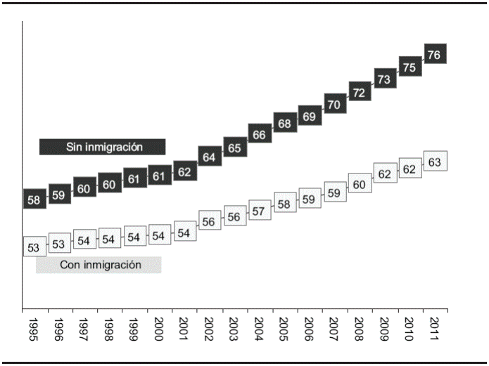 De esta forma, al comparar el nivel de envejecimiento efectivamente observado con el esperado en un contexto sin inmigración latinoamericana, vemos que la conjunción de los efectos directos e indirectos de esta inmigración ha permitido, por un lado, reducir 20% el índice de envejecimiento de la población, a la vez que retarda y hace más lento el avance de este mismo proceso. De momento, de no haber mediado los efectos de la inmigración, los niveles actuales de envejecimiento se habrían alcanzado al menos 10 años antes.