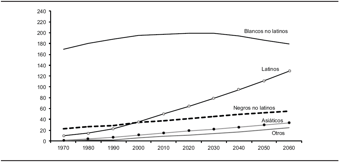 En primer lugar, los datos indican que la población blanca alcanzaría su máximo volumen hacia 2024, para iniciar un lento pero sistemático descenso que implicaría que hacia el año 2043 dejará de ser una mayoría absoluta para representar sólo 49% del total de la población de Estados Unidos, proporción que se reduciría a 43% hacia el año 2060. Por el contrario, se prevé que la población latina continúe su tendencia de crecimiento, logrando alcanzar la cifra de 130 millones en 2060, representando en ese entonces 31% de la población. Esto indicaría una sustancial reducción de la distancia absoluta y relativa que actualmente separa a ambos volúmenes demográficos. En efecto, si en 2010 la población blanca superaba a la latina en casi 150 millones de personas, para 2060 se espera que esta distancia se haya reducido a una tercera parte y que continúe descendiendo en las siguientes décadas.