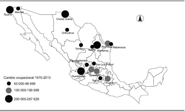 Como segundo punto se tiene que la redistribución del empleo manufacturero desde la Ciudad de México hacia el resto del territorio nacional presentó tres formas paralelas: de los 30 puntos porcentuales que se redistribuyeron entre 1975 y 2013, 20 puntos se acumularon en 16 ciudades, 6 en 73 ciudades y 4 se diseminaron entre las pequeñas ciudades y las localidades rurales del país. Las 16 ciudades con mayor dinamismo ocupacional, en orden descendente, fueron: Monterrey, Guadalajara, Tijuana, Ciudad Juárez, León, Puebla, Querétaro, Reynosa, Toluca, Saltillo, Chihuahua, San Luis Potosí, Aguascalientes, Torreón, Mexicali y Matamoros (mapa 1). Las cuatro primeras incrementaron su demanda ocupacional en por lo menos 200 mil personas, en tanto que de la quinta (León) a la octava (Reynosa) el crecimiento fue de entre 100 y 199 mil personas, y del puesto 10 (Toluca) al 16 (Matamoros) fue entre 50 mil y 99 mil trabajadores (mapa 1). Estas 16 ciudades aumentaron por lo menos en un punto porcentual su participación en el empleo manufacturero del país, salvo Monterrey y Puebla. Asimismo, estas ciudades se caracterizan por ser de las de mayor tamaño dentro del sistema urbano nacional (sólo Matamoros tenía menos de 500 mil habitantes en 2010), y la mayoría se ubica en la región Frontera Norte. Son ciudades que aprovecharon economías de aglomeración y su posición geográfica. En términos generales, al aumentar en mil habitantes su tamaño poblacional, la demanda ocupacional en la industria manufacturera se incrementó en 37 personas.