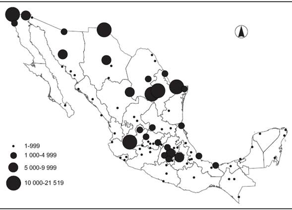 En 2008 el volumen de los bienes exportados se ubicó en 213 mil millones de dólares, a precios corrientes, de los cuales 203 mil millones se produjeron en alguna de las 90 principales ciudades, según estimación realizada por el autor del presente artículo. Estas ciudades participaron con 63% de la población nacional, 84% del empleo manufacturero y 95% de las exportaciones. Estos valores indican una alta condensación en los puntos de origen de las exportaciones. Según la estimación realizada, Tijuana y Monterrey generaron exportaciones por poco más de 20 mil millones de dólares, mientras que en Ciudad Juárez, Guadalajara, Reynosa y Saltillo el monto fue de entre 10 y 19 mil millones de dólares. Estas seis urbes participaron con 47% de la exportación total de manufacturas. A este grupo se le suma otra media docena con exportaciones entre cinco y nueve mil millones de dólares: Mexicali, Chihuahua, Puebla, Ciudad de México, Hermosillo y Torreón (mapa 2). Estas 12 metrópolis fueron el origen de 70% del total de las exportaciones manufactureras.