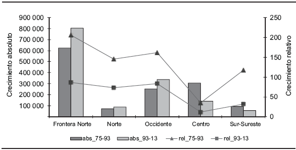El crecimiento absoluto y relativo en la demanda ocupacional en el subsistema urbano de la región Frontera Norte superó ampliamente al ocurrido en el resto de subsistemas regionales en ambos periodos de estudio. En la gráfica 1 se aprecia también menor crecimiento relativo en todas las regiones en el segundo lapso temporal en relación con el primero. El crecimiento absoluto en las regiones Centro y Sur-Sureste fue mucho menor en el periodo 1993-2013 que el registrado en 1975-1993. Las entidades federativas que forman parte de la región Norte son Baja California Sur, Durango, Nayarit, San Luis Potosí, Sinaloa y Zacatecas. Por su parte, la región Sur-Sureste se compone por Campeche, Chiapas, Guerrero, Oaxaca, Quintana Roo, Tabasco, Veracruz y Yucatán.