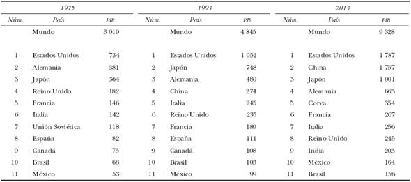 El PIB mundial de la industria manufacturera aumentó de 3 billones de dólares en 1975 a 9.3 billones en 2013, a precios constantes de 2005 (cuadro 1), lo que significó una TCPA de 3%. Su concentración territorial reflejaría, en principio, poco cambio porque tanto en 1975 como en 2013 las cinco naciones con mayor PIB manufacturero concentraron 60% del total mundial. Sin embargo, el cambio se hace patente en 1993 cuando China se incorporó al listado en la cuarta posición, escalando al segundo puesto en 2013, y a partir de 2014 es la nación con mayor producción industrial. Asimismo, los países con más elevado crecimiento relativo fueron Japón, México e Italia en el periodo 1975-1993, y Estados Unidos, China y México en el lapso 1993- 2013. En 1975 Estados Unidos participó con 24% de la producción manufacturera planetaria, cifra que disminuyó a 19% en 2013.