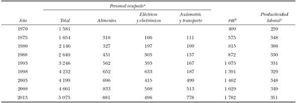 Los grupos de la industria manufacturera de alimentos, eléctricos y electrónicos, y automotriz y transporte son los más representativos en la estructura productiva nacional debido a su participación en la demanda ocupacional total y su dinamismo en el tiempo. La producción de alimentos es una actividad tradicional y básica en la estructura manufacturera del país. Su crecimiento ocupacional fue constante y su ritmo de crecimiento fue similar al total de la industria manufacturera, de tal modo que su aportación se mantuvo en alrededor de 17%. Por su parte, los grupos de artículos eléctricos y electrónicos, y automotriz y equipo de transporte son los más representativos de México en su inserción en los mercados internacionales, por ser los que tienen los mayores montos de bienes exportados, pero también de insumos importados. Su participación conjunta en la ocupación total del país aumentó de 13% en 1975 a 25% en 2013. La información del censo de 1998 no permite evaluar la evolución de ambos grupos respecto a 1993 y 2003, ya que en esa fecha se contabilizaron autopartes eléctricas y electrónicas en el grupo de artículos eléctricos y electrónicos, pero en 2003 se volvieron a incluir en el automotriz. Se debe destacar el magro crecimiento ocurrido entre 2008-2013 en el primer grupo, en comparación con el importante dinamismo ocurrido en el rubro automotriz y equipo de transporte.