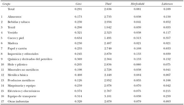 En la literatura se identifican al menos cuatro índices para estimar cuantitativamente la concentración geográfica de la actividad económica: i) Gini; ii) entropía de Theil; iii) Herfindahl, o Hirschman-Herfindahl, y iv) aislamiento de Lieberson (Dávila, 2004: 221-225; Goodall, 1987: 195 y 469; Robinson, 1998: 256-265 ). Asimismo, las variables comúnmente empleadas son personal ocupado o producción. El índice de Gini (IG), y la curva de Lorenz como su apoyo gráfico, compara la distribución geográfica de un grupo de actividad en relación con una distribución hipotética igualitaria dada por la distribución geográfica de la actividad total. Su método de cálculo es: