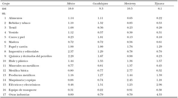 En este caso, los grupos industriales en los que se especializa una ciudad son aquellos con un IEL mayor a uno. Por ejemplo, un valor de 2.5 indica que la presencia de ese grupo industrial en la estructura ocupacional de la ciudad en cuestión es 2.5 veces mayor con respecto a la presencia de ese grupo en la estructura ocupacional nacional.