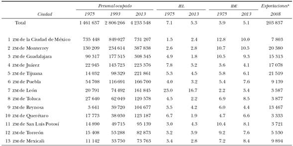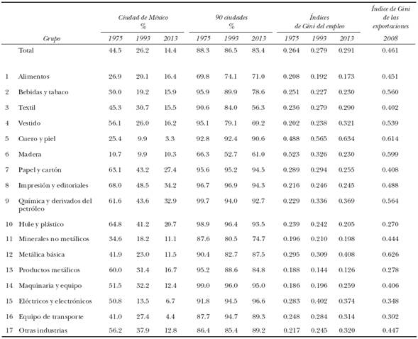 El cambio territorial se resume en seis elementos: i) desindustrialización y pérdida participativa de la Ciudad de México, ya que en 1975 concentraba 44% de la demanda ocupacional, y para 2013 su participación disminuyó a 14%; ii) redistribución de la demanda ocupacional hacia ciudades de mayor tamaño poblacional y hacia el subsistema urbano de la región Frontera Norte, por lo que hubo aprovechamiento de economías de aglomeración y posición geográfica; iii) incremento en la concentración geográfica en el total manufacturero y en 11 de los 17 grupos de actividad, a decir de los índices de Gini, por lo que un pequeño grupo de ciudades aprovecharon ventajas competitivas asociadas a economías de aglomeración y costos de transporte; iv) tendencia hacia la diversificación en la estructura productiva de la mayoría de las ciudades, situación que habla de la irrupción de economías de urbanización; v) mayor concentración geográfica de las exportaciones en relación con la producción total, debido a que 12 ciudades generaron 70% de las ventas manufactureras al exterior en 2008, y su participación en el personal ocupado de la industria era de 52%, y vi) los factores explicativos de la localización industrial fueron distintos en el periodo 1975-1993 respecto a los de 1993-2013, ya que el cambio en el primero obedeció al aprovechamiento de economías de aglomeración en las grandes ciudades y economías de escala de las grandes empresas, mientras que en el segundo se explicó otra vez por el aprovechamiento de economías de escala, pero también por condiciones favorables para la exportación.