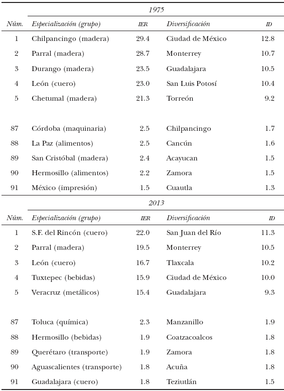 Los grupos de actividad de cuero y calzado, química, maquinaria, eléctricos y electrónicos, y equipo de transporte fueron los que más aumentaron su nivel de concentración geográfica entre 1975 y 2013. Las ciudades responsables de la mayor concentración espacial fueron las siguientes (los nombres en letras cursivas indican que esas ciudades estaban especializadas en el grupo de actividad en cuestión en 1975):