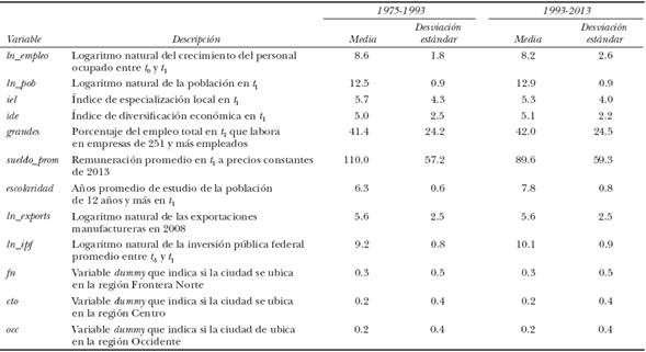 Los valores promedio de la variable dependiente ponen de manifiesto dos procesos durante el periodo de estudio. El primero se refiere al mayor dinamismo en la demanda ocupacional durante el periodo 1975-1993 en relación con el lapso 1993-2013, situación ya reseñada con anterioridad. El segundo tiene que ver con la mayor variación en el crecimiento ocupacional entre las ciudades de estudio durante el segundo corte de tiempo. En el primero el coeficiente de variación se ubicó en 21%, aumentando a 32% para el segundo.