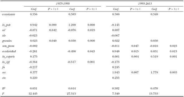 Por lo que respecta a los valores de las variables independientes se tiene lo siguiente: las ciudades mostraron tendencia hacia la diversificación de su estructura ocupacional, aunque a velocidad discreta. Las grandes empresas ocupaban en promedio dos de cada cinco trabajadores manufactureros y no hubo avance significativo en el proceso de concentración técnica. La remuneración promedio al personal ocupado disminuyó casi 20% entre 1993 y 2013, es decir de 110 mil a 90 mil pesos por ocupado al año, a precios constantes de 2013. Del mismo modo, la variación en el ingreso promedio entre ciudades aumentó de 52 a 66%. Estos dos elementos reflejan el deterioro en las condiciones del mercado de trabajo y el aumento en la desigualdad social entre los trabajadores. De forma paralela aumentó en 1.5 años el promedio de escolaridad de la población de 12 años y más, es decir aquella que potencialmente puede ofrecer su fuerza de trabajo. Estos datos ratifican diagnósticos elaborados con anterioridad: el aumento en la escolaridad no se tradujo en un incremento en las remuneraciones ni en el ascenso de la productividad (Romero, 2014: 119-139).