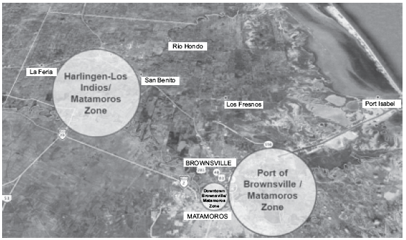 Más recientemente, en 2011, se emprendió un nuevo proyecto, el Bi-National Economic Development Zone (BiNED Zone), a propuesta y liderazgo de United Brownsville, una organización pública-privada. A principios de 2014, los alcaldes de Brownsville, Harlingen y Matamoros firmaron el acuerdo para su desarrollo y la creación del comité encargado de su seguimiento, con lo que se dio inicio al proyecto. La iniciativa se inspiró en parte en la experiencia transfronteriza de Reynosa y McAllen, también en la frontera Tamaulipas-Texas (Hirschberg, 2011), mucho más cercana a la planificación estratégica de carácter económico que a la territorial, y en el estratégico Imagine Brownsville Comprehensive Plan, elaborado en 2009 también por United Brownsville. La propuesta inicial respondía a los efectos regionales de la crisis económica mundial de 2008, a la refronterización por parte de Estados Unidos y a la violencia e inseguridad en México. Posteriormente se ha ido nutriendo de las expectativas generadas por varios proyectos de desarrollo territorial: un nuevo puente internacional ferroviario al oeste de Matamoros y Brownsville, la autopista interoceánica Mazatlán-Matamoros, la explotación petrolífera frente al litoral de Matamoros propiciada por la reforma energética en México y la construcción de un puerto en Matamoros y de un complejo aeronáutico en Brownsville (Space X). El proyecto busca incrementar el desarrollo económico de las tres ciudades por medio de la colaboración, la captación de inversión de capital internacional, el aumento de las exportaciones, la mejora de los espacios urbanos y de la integración urbana, y la dotación de infraestructuras de transporte, así como afrontar los retos de la seguridad fronteriza (González, 2011). A efectos de planificación se definieron tres áreas geográficas de actuación (mapa 2): la zona de Harlingen-Los Indios-Matamoros occidental, el puerto de Brownsville-Matamoros oriental, y los centros (downtown) de Brownsville y Matamoros. El proceso de concreción está siendo lento y a principios de 2015 sólo se habían discutido las oportunidades en el ámbito energético y comercial.