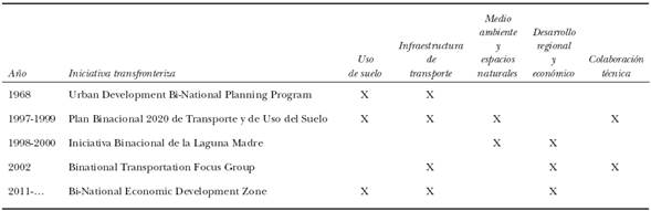 En el caso específico de las ciudades de Matamoros y Brownsville, desde fines de la década de 1960 se concertaron en varias ocasiones sus políticas urbanas y se emprendieron iniciativas transfronterizas. Se han identificado cinco que, total o parcialmente, abordan cuestiones urbanas (cuadro 1). Estas iniciativas se desarrollaron paralelamente y a raíz de la reivindicación y planificación de nuevos puentes internacionales, infraestructuras que suponen claramente la dimensión transfronteriza y binacional. Además de ambas ciudades, en algunas iniciativas participaron otros territorios, como el municipio de Valle Hermoso, en Tamaulipas, y los condados de Cameron -donde se halla Brownsville- y Willacy, así como la ciudad de Harlingen, también en Cameron, en Texas. Salvo algunas excepciones, sólo se alcanzaron limitadas y escasas metas debido a los obstáculos político-institucionales, socioculturales y geográficos y por la falta de consenso y de voluntad política real para participar y/o aplicar sus resultados. A pesar de ello, la cantidad de proyectos pone de manifiesto el reconocimiento y, en algunos casos, la incorporación de la dimensión transfronteriza en la planificación y la gestión urbanas y la existencia de un interés por la convergencia.