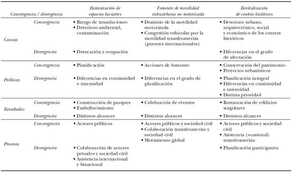 Para la evaluación de las oportunidades de colaboración transfronteriza en el ámbito de la planificación y la gestión urbanas se han seleccionado tres retos urbanos que actualmente afrontan ambas ciudades. Los tres son compartidos y, por lo tanto, aparecen como potenciales temas de colaboración. A continuación se exponen sus principales características en relación con la convergencia / divergencia de causas, políticas, resultados y procesos. Se muestra una síntesis de los resultados en el cuadro 2.