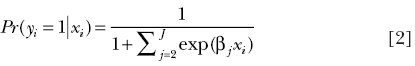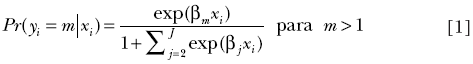 donde Pr (yi = m | xi ) es la probabilidad del resultado m de una variable dependiente con J resultados, dado un vector de variables independientes xi. Los betas representan el cambio en el log-odds de pertenecer a un grupo en relación con la categoría base como el valor de los cambios en la variable xi por cada unidad.