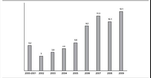 En la gráfica 3 se presenta la evolución en el porcentaje de hogares receptores de remesas en la década de 2000 utilizando microdatos de la Encuesta Permanente de Hogares de Paraguay (2000-2009). Como tendencia general, puede observarse que en casi todos los años considerados el porcentaje de hogares receptores fue en aumento (salvo el periodo 2000-2001, cuando se aplicó una encuesta integrada para ambos años y se contabilizaron dos años juntos, y el año 2008). En efecto, se trata de un flujo monetario de considerable magnitud y estabilidad en el tiempo, que adquiere mayor relevancia en los últimos años. La importancia cuantitativa, así como la sostenibilidad en el tiempo de las remesas que reciben algunos hogares de Paraguay, sugieren la necesidad de ampliar los estudios que den cuenta de los vínculos entre los procesos migratorios hacia el norte y hacia el sur, y cómo esto tiene efectos sociodemográficos y socioeconómicos en el país.