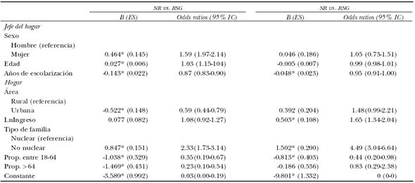 El análisis bivariado mostró diferencias entre los tres grupos de hogares comparados. A continuación se presenta el análisis multivariado mediante un modelo de regresión logística multinomial (MRLM); en el cuadro 3 se presentan los coeficientes y los odds ratios para cada variable. El MRLM es más riguroso que el simple examen bivariado y analiza los principales predictores de la recepción de remesas internacionales del sur y del norte globales. La variable dependiente tiene las siguientes categorías: no recibe remesas, recibe remesas del sur global y recibe remesas del norte global. Como puede observarse, los principales factores asociados a la recepción de remesas del sur son: el sexo del jefe de hogar: los hogares con jefatura femenina tienen más probabilidad de recibir remesas del sur que los hogares con jefatura masculina. La edad: los jefes de mayor edad son más propensos a recibir del sur que a no recibir. Los años de escolarización: a medida que aumentan los años de escolaridad la tendencia a recibir remesas del sur decrece. En relación con las áreas, los hogares urbanos tienen menor propensión a recibir remesas del sur global. Como es de esperarse, las familias no nucleares, es decir incompletas, se inclinan más a recibir remesas. El efecto de la familia incompleta es fuerte. Los hogares con mayor proporción de integrantes en edades activas tienden más a no recibir y las que tienen mayor proporción de adultos también.