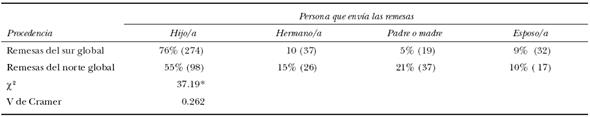 Los procesos vinculados al envío y utilización de las remesas involucran cuatro dimensiones secuenciales (Cerrutti, 2008; Cerruti y Parrado, 2007): a) el origen, quiénes son los migrantes que envían las remesas; b) las formas de envío, principalmente si se hace o no a través de canales formales; c) las características de las familias receptoras, y d) su utilización (consumo, ahorro o inversión). En la sección anterior detallamos las características de los hogares receptores. De manera específica, en esta sección se pretende analizar de manera comparativa las particularidades que presentan en cuanto a: quiénes envían las remesas, el medio de envío y el destino de estos fondos.