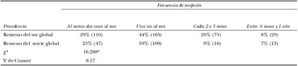 Como puede observarse en el cuadro 5, la recepción de remesas del norte se produce en más de la mitad de las ocasiones mensualmente (59%), y en segundo lugar de importancia estos envíos se producen al menos dos veces al mes (25%), sugiriendo la intensidad de los vínculos familiares. En el caso de las remesas del sur, los porcentajes en cuanto a las mismas categorías disminuyen (44% envía mensualmente y 29% al menos dos veces al mes). Cabe destacar que los envíos cada dos o tres meses son más relevantes ya que implican 20%, en tanto que en la recepción de remesas del norte este porcentaje es de tan sólo 9%. Según su estudio, Cerrutti y Parrado (2007) señalan, en relación con las remesas provenientes de Argentina hacia Paraguay, que es frecuente que se retorne al hogar con ahorros y que esto puede implicar una subestimación del total de las remesas.