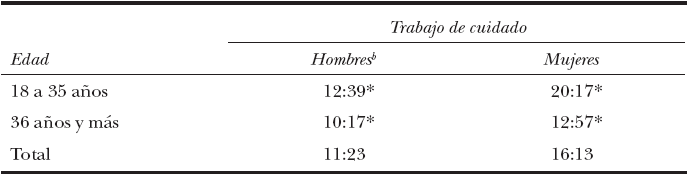 Si el análisis se realiza comparando el tiempo per cápita de las mujeres de 12 años y más de los hogares por edad de los hombres, se observa cómo en ambos grupos de población las mujeres son quienes dedican mayor tiempo al trabajo de cuidado. En relación con los hombres de 18 a 35 años, la diferencia del tiempo efectivo promedio que las mujeres dedican por semana es de 7 horas y 38 minutos, y en el caso de los hombres de 36 años y más, la diferencia respecto a las mujeres es de 2 horas y 40 minutos.