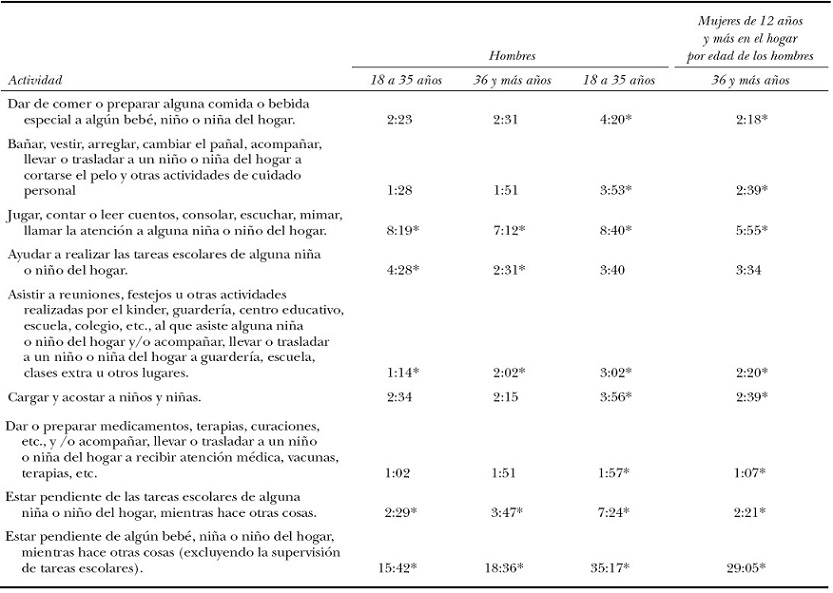 Al realizar una comparación entre ambos grupos de edad puede determinarse que la actividad a la que ambas poblaciones le asignan más tiempo es a jugar, contar o leer cuentos, consolar, escuchar, mimar o llamar la atención a alguna niña o niño del hogar, y que la actividad a la que menos tiempo le dedican ambos grupos es dar o preparar medicamentos, terapias, curaciones, etc., o acompañar, llevar o trasladar a un niño o niña a recibir atención médica, vacunas, terapias, etc. Debe indicarse que al realizar las pruebas de hipótesis de diferencia de promedios, en todas aquellas actividades a las que los hombres de ambos grupos de edad dedican menos de dos horas a la semana, las diferencias no resultaron estadísticamente significativas al 5 por ciento.